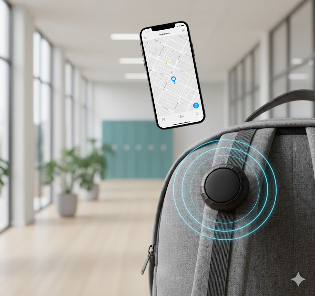 Smart backpack with a device on it, showing an app interface on a smartphone in a school hallway.
