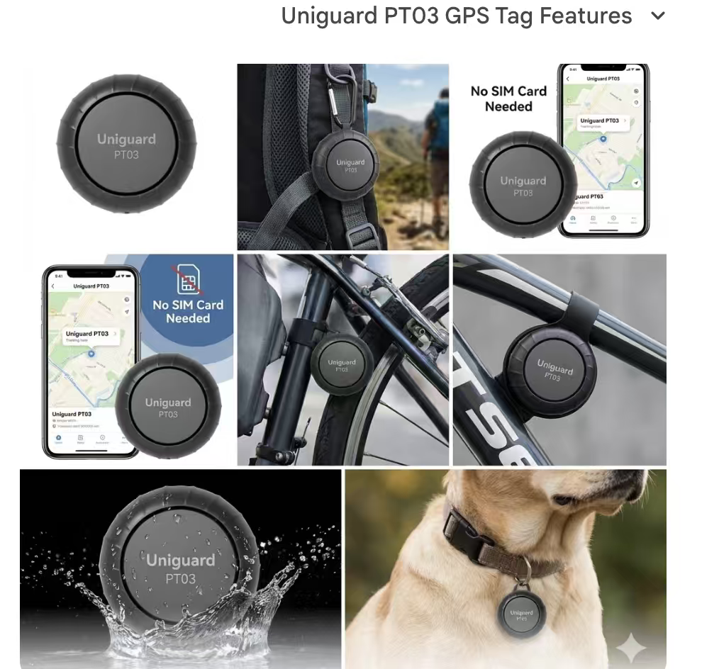Collage of dogs and cats wearing UniGuard PT03 GPS tags with product details.